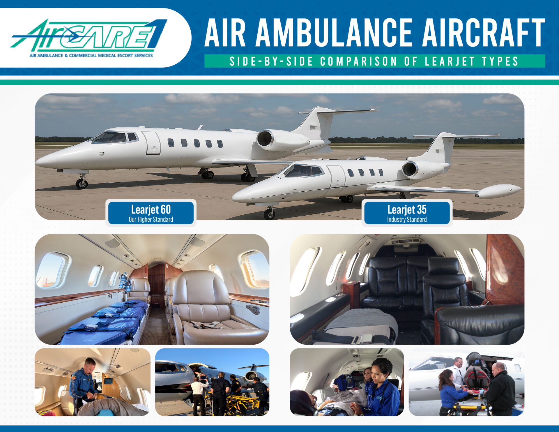 At AirCARE1, we know that air medical transport is one of the most important trips you will ever take. Our team is here to provide safe, reliable, and compassionate care every step of the way. Contact us today to discuss your Learjet 60 long-range air ambulance needs and ensure your family’s peace of mind.