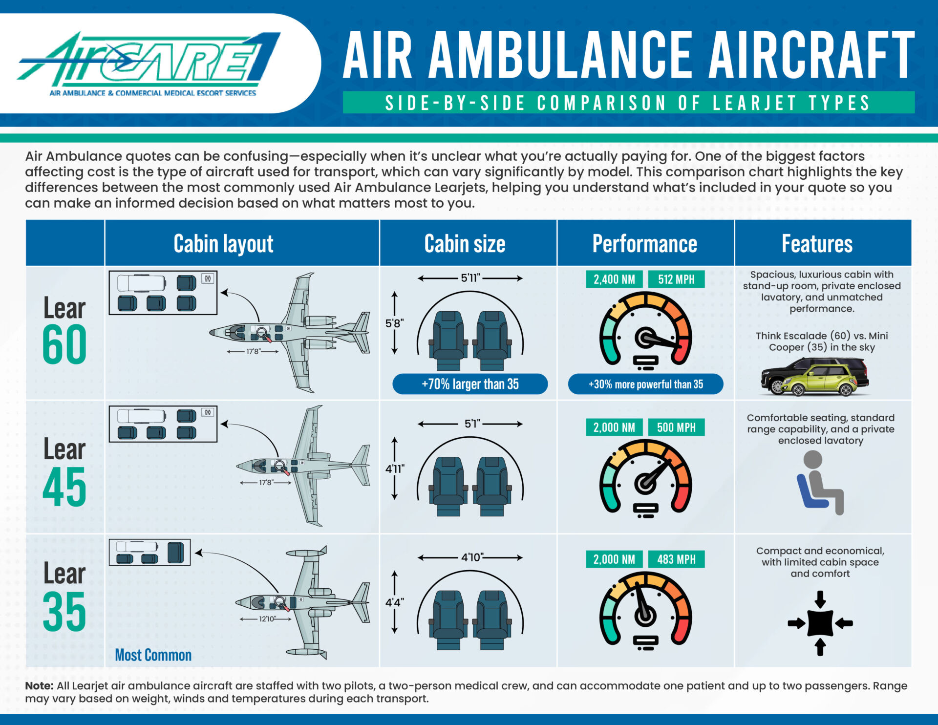 At first glance, a Learjet is a Learjet – but not all models are the same. The three most common jets used in medical transport are the Learjet 60, Learjet 45, and Learjet 35. Each offers different levels of comfort, performance, and cost. Understanding these differences can help you feel more confident about your choice.